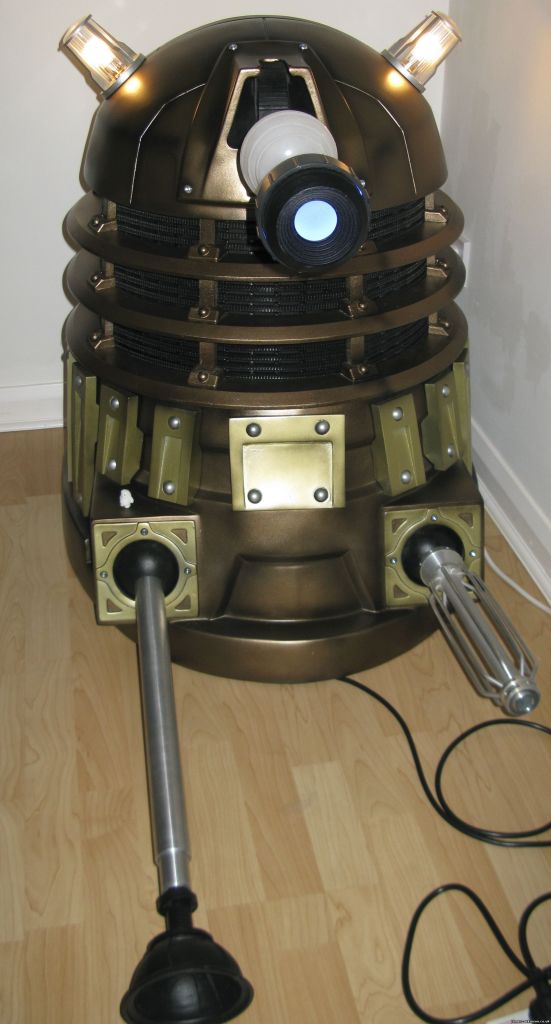 Last month I took delivery of a full size NSD Dalek after waiting after they made it at their workshop. The director, Ian Clarke, was very helpful on the telephone and gave me the options. I stuck by my intention of getting a slightly dirtied looking bronze version with voice and lights. When the delivery day came I was extremely excited by the prospect but after going to the Doctor Who Experience in Cardiff, earlier in the year and witnessed the size of the base I was slightly concerned whether it would fit through our internal doors. I asked Ian and he said someone called Toby would be delivering it and would install it. I knew who Toby was from watching the new version of ‘Day of the Daleks’. That is a Jon Pertwee story from 1972 that reintroduced the Daleks after a long time off the screen. It also was a tremendous story regarding time travelling loops also known as the bootstrap paradox recently perfectly updated with an excellent story called ‘Before the Flood’ with Peter Capaldi. When the ‘Day of the Daleks’ was brought out as a special edition in 2011 it included new footage and CGI effects. Nicholas Briggs performed updated Dalek voices (as the originals did not sound right) and this is where Toby comes into it. Toby Chamberlain made and performed the Dalek in the newly filmed sections. His eye for detail even helping with the Ogrons by using a costume that Toby created himself.
