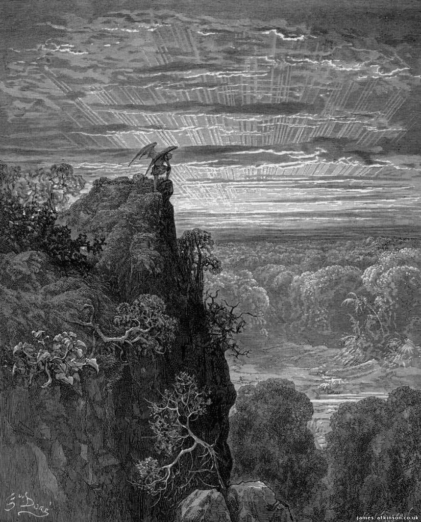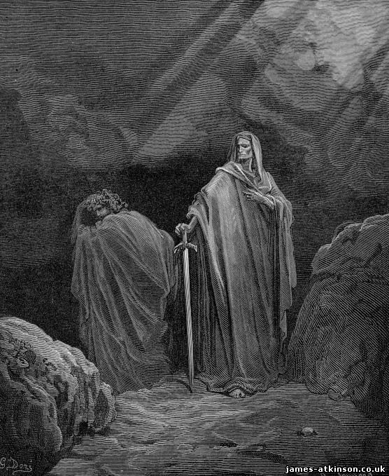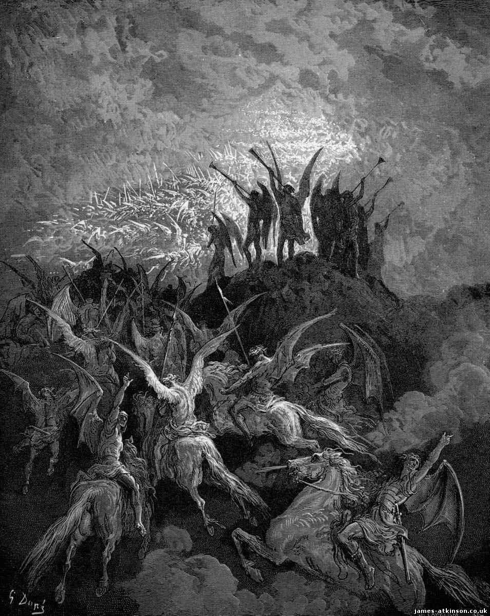 To appreciate the album, an understanding of Milton’s vision is required. To help illustrate this I am going to include a selection of the magnificent fifty plates of engravings from 19th Century French artist Gustave Doré. The summery of the poem is that God had a war waged against him in Heaven by angels with the plot being devised by a favoured angel named Lucifer. Lucifer and his followers were cast out to hell. Bitter for revenge Satan plots man’s downfall. He turns into a serpent and tempts Eve eat of the forbidden fruit. It is a very familiar story that has been recounted numerous times. The difference is that Milton expands on these events and explores the themes in extreme detail. He explains how Satan, after his expulsion to hell, builds a palace he names Pandemonium. Here he sets up a council in order to decide his next steps. Should he start a new battle with God and take over Heaven or find another method of vengeance. Satan decides to go to a prophesied ‘new world’ It is in effect a form of terrorism that he decides to use. He is let in by his offspring, Sin and Death, and journeys across chaos. God witnesses this and foretells the fall of man. This is where his son offers to sacrifice himself for man’s salvation.
