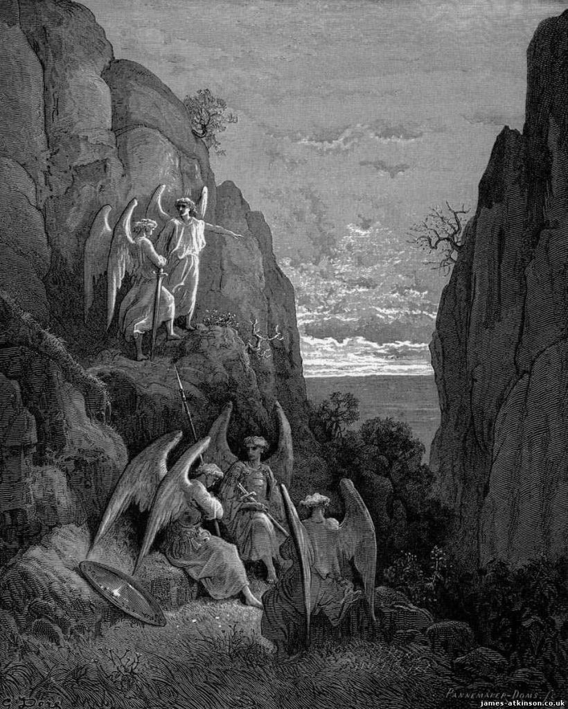 Uriel, an angel, is tricked into directing Satan to the home of man. This is where he finds the Garden of Eden. Adam and Eve are there and Satan becomes jealous of them. At that time Uriel warns Gabriel and his angels and they cast Satan from Paradise. The angel Raphael is sent by God to warn Adam and Eve of Satan and his plans. He then explains to them how Satan was once a favored angel but jealousy of God’s son led him to wage a battle in heaven. Raphael continues telling them how Satan and his followers were cast out and the earth was designed in order to one day replace all the fallen angels in heaven with mankind.